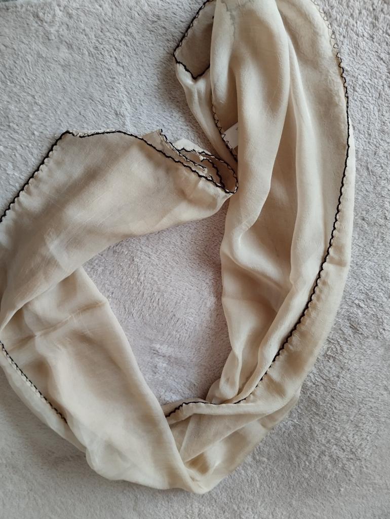 The scarf is very beautiful, the color is a delicate beige. The material is pleasant, soft, without shine. I recommend it!