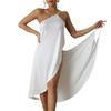 It has off-shoulder, backless, multiple ways to wear, V-neck, loose, mid-length features, and it can be used as a swimsuit cover-up.