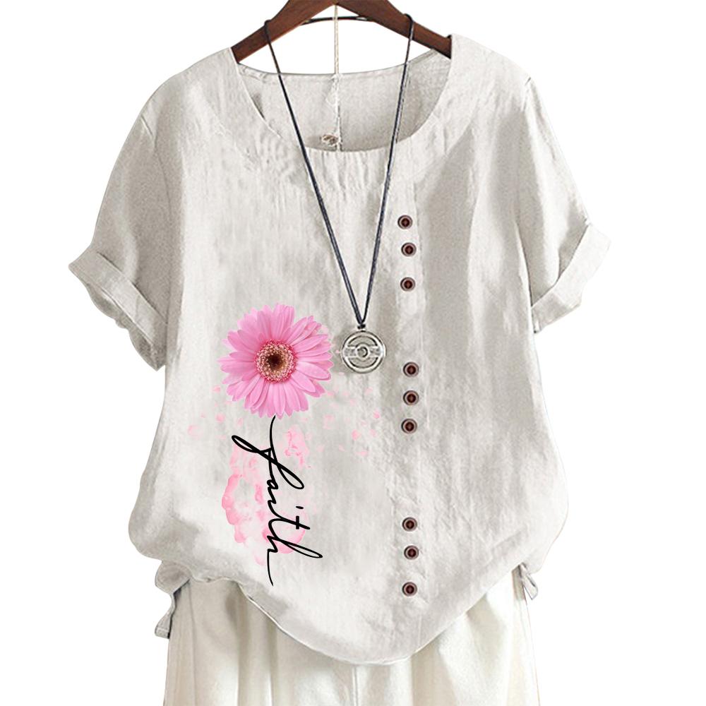 Womens Floral Print Cotton Casual Top with 6 Patterns, Round Neck, Short Sleeves, Button Embellishments