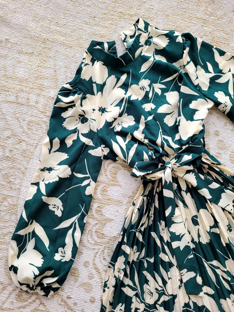 Elegant midi dress, pleated dress with matching belt 👗👍! Delivery time 🌞: 42 days to Germany. ♻️Scope of delivery: The delivery includes a beautiful pleated dress 👗 in the appropriate size and color. The product is available in 2 colors: black and green. It is available in sizes S to XL. I ordered the product in size S in green and the dress 👗 fits me perfectly and the color is exactly as shown. 🤗🤗🤗👍 I normally wear dress size 36 (S). I weigh 55kg and am 167cm tall. The dress is true to size. 🌞Quality ♻️: The dress is light and swings beautifully. Very comfortable on the skin. The dress has a small V-neck and a matching belt with an elastic band at the waist. You can use the dress 👗 for a party or for everyday use. Perfect for spring and summer!!👌👌👌👌I particularly like this great floral print. It looks so beautiful!!👍👍👍👍I like pleated dresses!💯💯💯💯💯 This dress 👗 arrived in top condition💯💯, I didn't even iron it. ✅️Material composition: polyester. But the material is very comfortable on the skin. I think the DRESS 👗 is simply mega🔝🔝🔝🔝🔝 ✳️Summary ✳️: A beautiful casual long-sleeved pleated dress with the belt 👗 that you can order in your normal size. I am happy to recommend the product. 5 stars. 🌟! Thank you Joom and the seller Hi Dawn!🤗🤗🤗👗