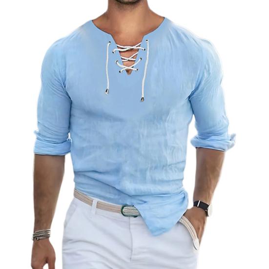 Men Spring Fall Shirt Lace-up V Neck Solid Color Long Sleeves Slim Fit Retro Soft Breathable Mid Length Pullover Casual Daily Top — buy online with free worldwide shipping!