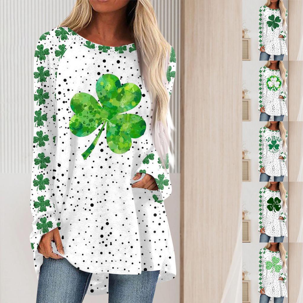 Fashionable Women's Casual Loose Round Neck Long Sleeved Saint Patrick Printed T-shirt Top