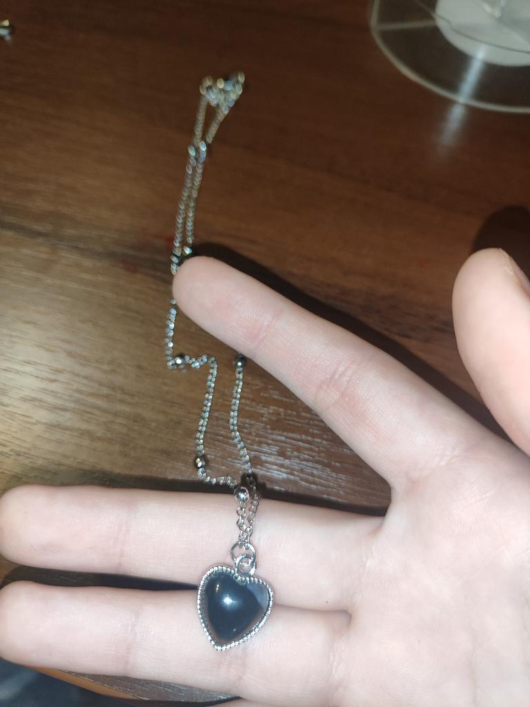 The color is like in the picture, only at the right angle under the light, otherwise it's just plain black.. smaller than I thought, The heart moves away a little.. ok, but the price is too high for the quality