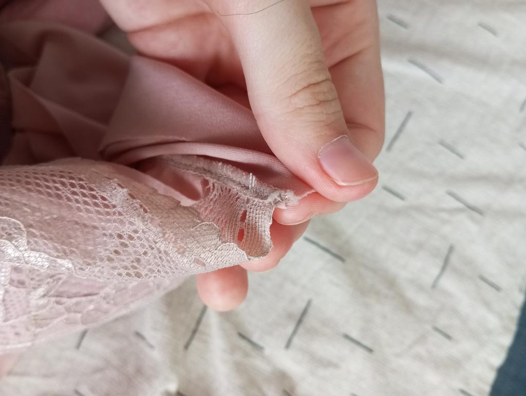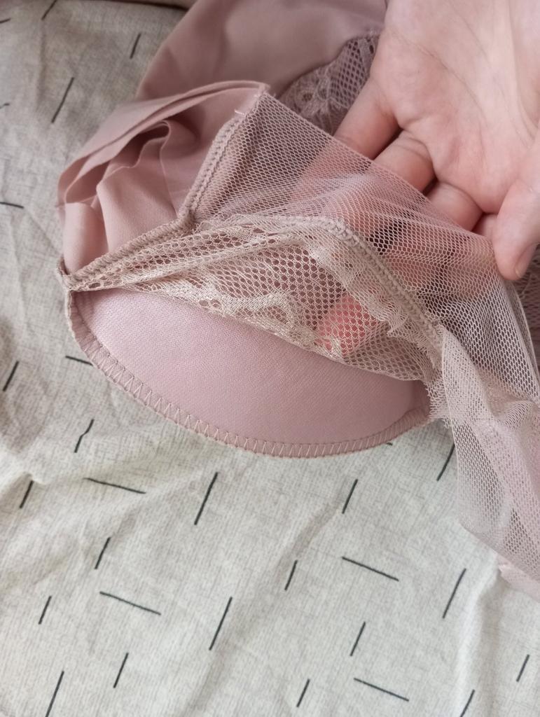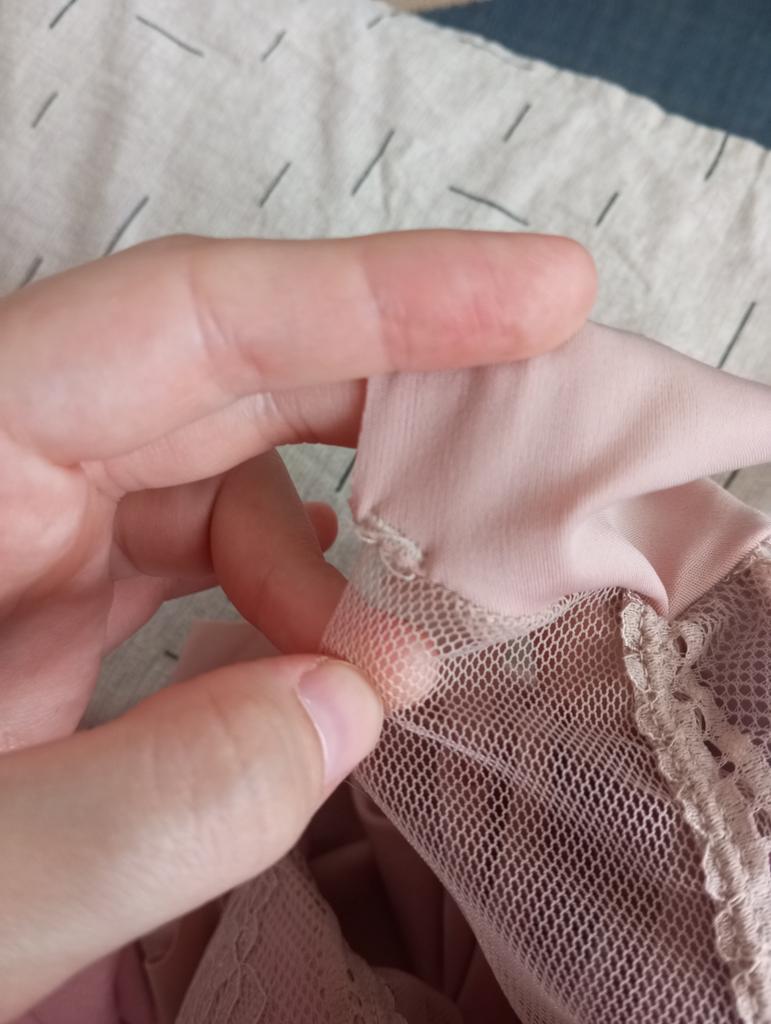 Seems to be the right size, maybe it hasn't broken in yet Regarding the cons: - threads stick out, almost everywhere, and the seams are processed carelessly - the sewn-in label cuts into the skin (very thoughtlessly, it's better to do without) - the cups are not sewn to the fabric, which is also bad, and the edges are poorly finished, I'm not sure they will hold their shape after several washes, they need to be resewn Positive sides: + The fabric and colors are very pleasant + Lace looks beautiful + I've been wearing a similar top for a year, they are very comfortable Overall a very good option for its price, but you need to be prepared that it might need hemming.
