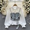 Korean Series Wear Age-Reducing Set Retro Denim Cami Stacked All-Matching Puff Sleeve Shirts Two-piece Set Top