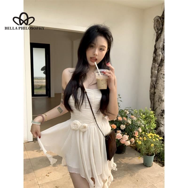 Summer Korean Style Design Sense Strapless Dress Women's Waist Flower Slimming A- Shaped Irregular Hem Short Dress — buy online with free worldwide shipping!
