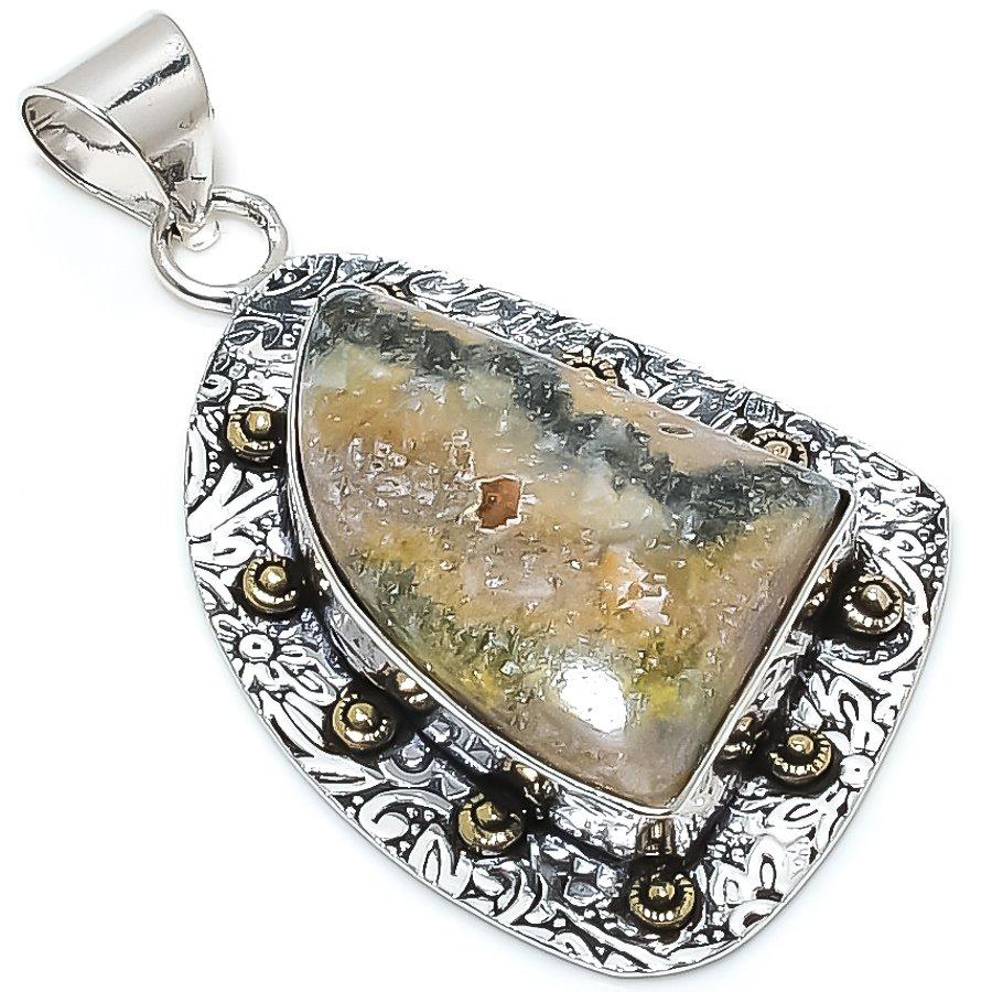Natural Bumble Bee Jasper Stone 925 Sterling Silver Two Tone Pendant 2.21"