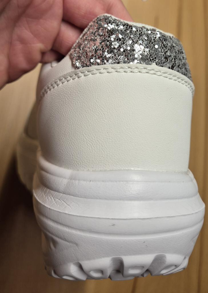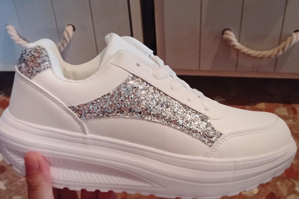 👟 I received the white sneakers with integrated silver glitter after three weeks of delivery, well packaged and consolidated in Austria. 👟 The shoes have a platform sole and shoelaces to adjust them well to the foot, furthermore they are as light as a feather and you feel absolute comfort. 👟 A dreamy shoe model that is available in a variety of sizes and turns every foot into an eye-catcher. The sneakers can be perfectly combined with various trousers and skirts and thanks to the size chart the shoes fit perfectly. 👍🔝💯👟 I would highly recommend this model! Music by Capcut pro