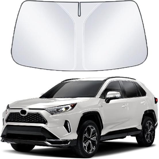 🚗【PERFECT COMPATIBILITY FOR YOUR CAR】- Omocyra windshield sun shade customs fit for Toyota RAV4 SUV Crossover, LE, XLE Premium XSE Adventure Hybrid Prime 2024 2023 2022 2021 2020 2019, reinforced steel ring and velcro buckle can be installed around the rearview mirror, make the sunshade for car windshield perfectly fixed on the front car window, no light leakage, precise fit design, not easy to loose