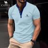 2024 Summer Men's Solid Color Pit Stripe Casual Button V-neck Slim Fit Embroidered Short Sleeved T-shirt