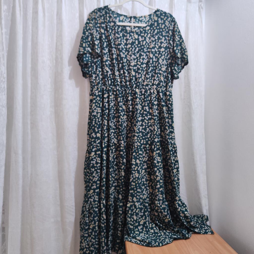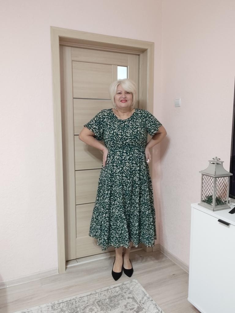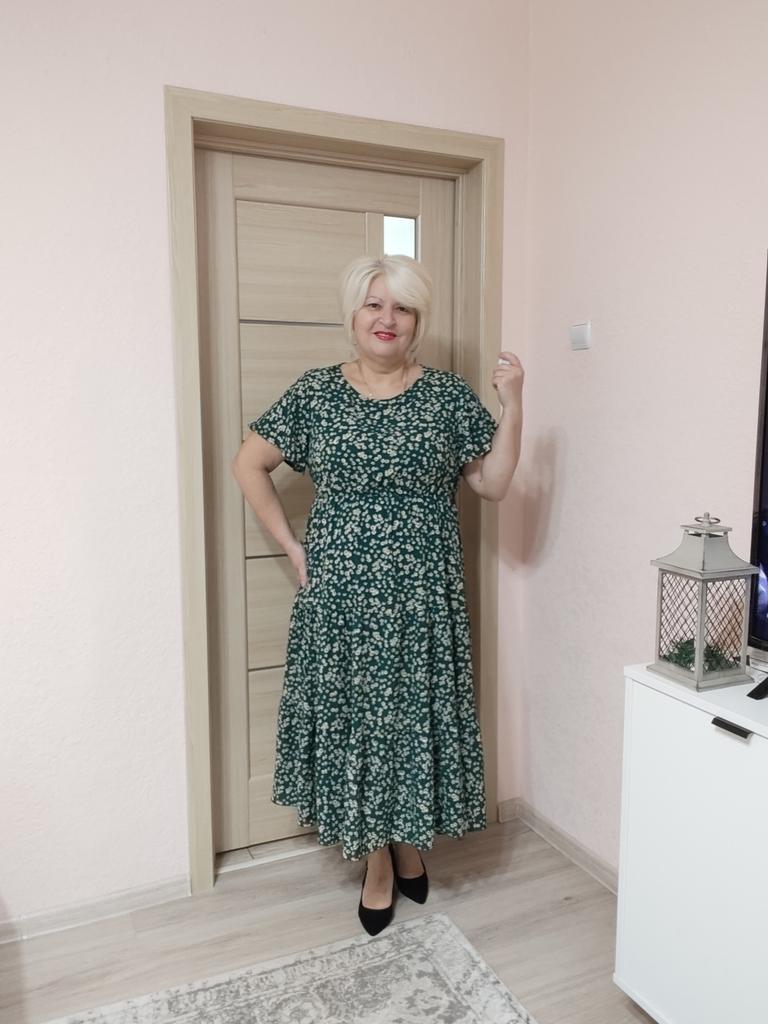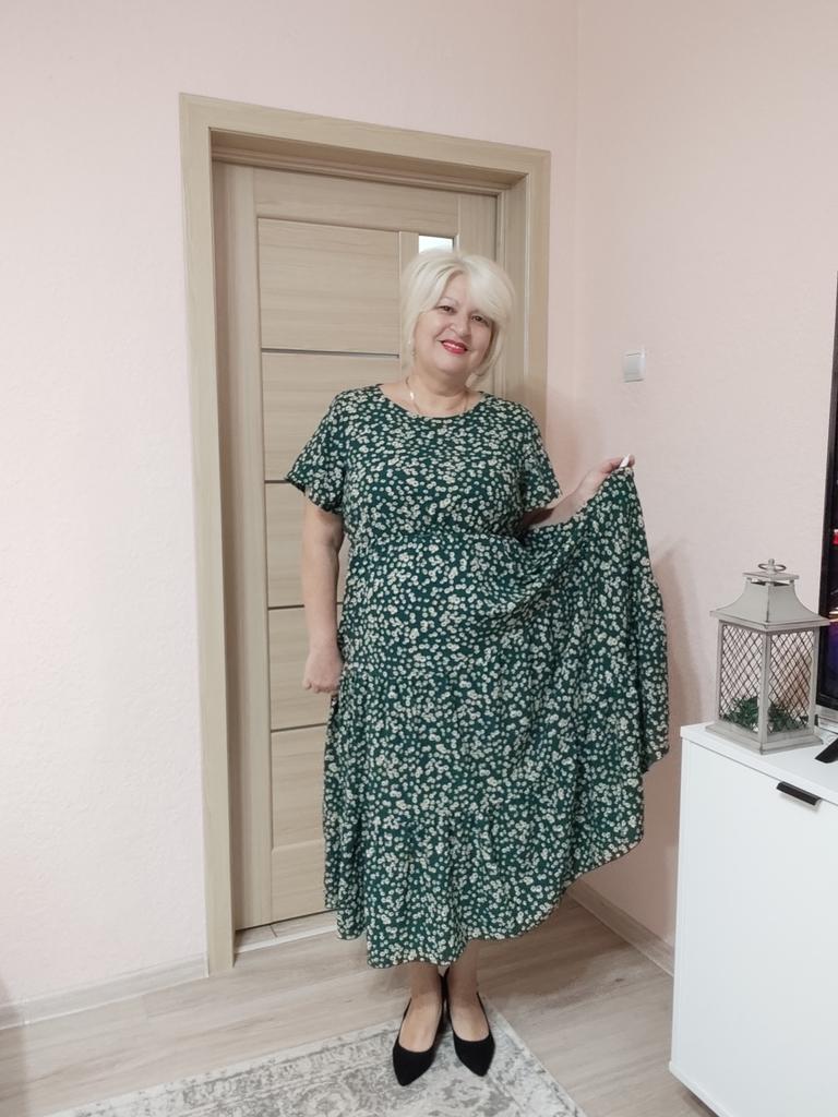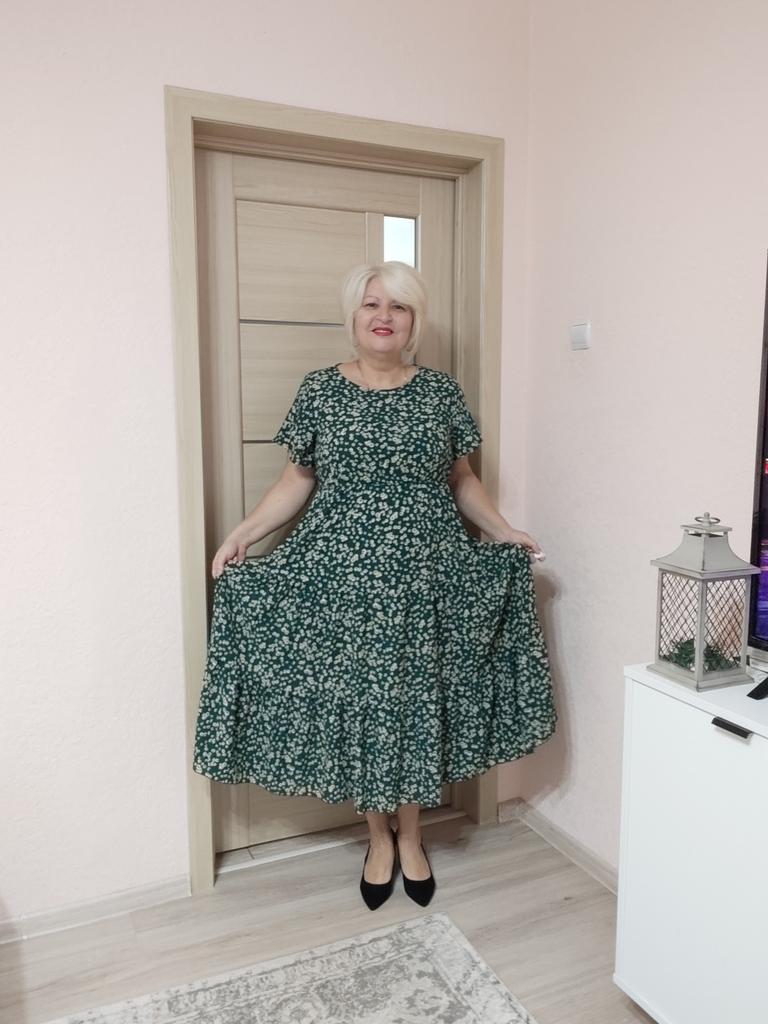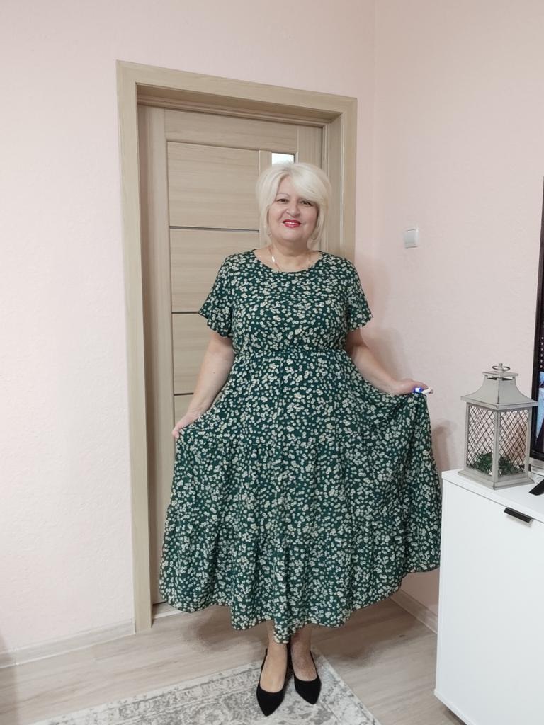 🌺Floral print dress. 🌺Plus sizes: XL-4XL 🌺I'm wearing size XL, it will fit sizes 50+. 🌺Dress in one color, beautiful dark green with small flowers. 🌺The dress has an A-line cut and a skirt with three tiers. The sleeves are of the butterfly type.. 🌺The fabric is quite heavy, flows beautifully with every movement. The tailoring is very neat. 🌺Length of the midi dress. 🌺A beautiful dress that will be suitable for spring-summer.👍😘😘😘