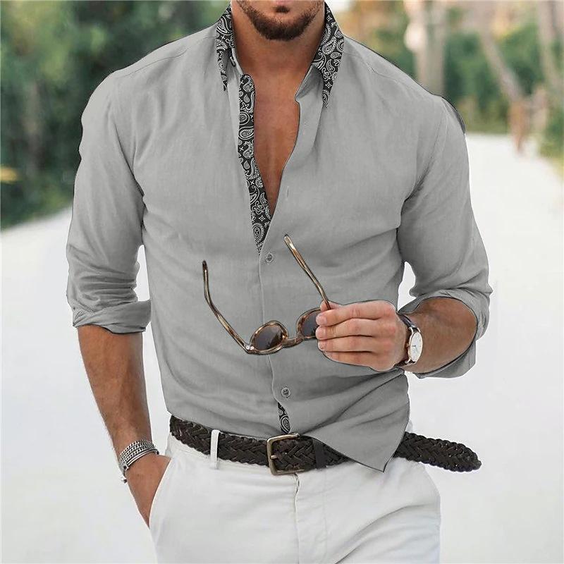 Men's Top Long Sleeve Color Matching Lapel Shirt Youth Home Man Grey Blue Fashion Loose Fit Large Size Linen Shirts