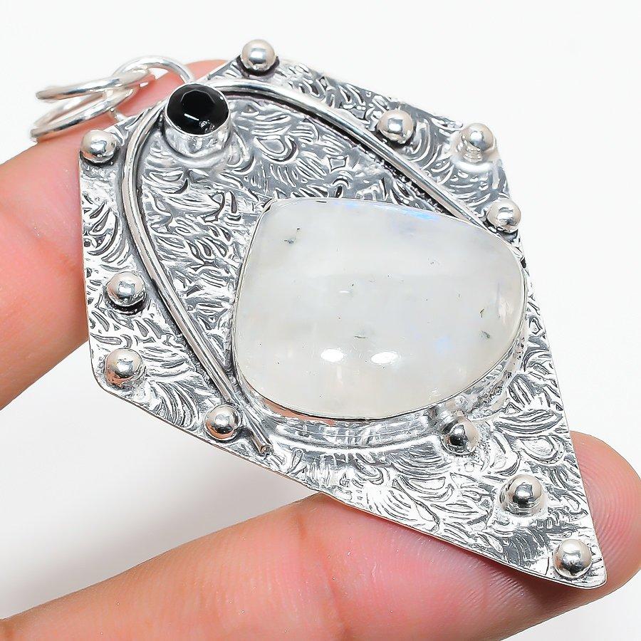 Natural Rainbow Moonstone, Spinel 925 Sterling Silver Gift Pendant 2.88"