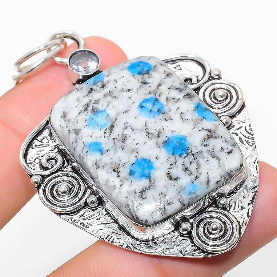 Natural K2 Blue Azurite, White Topaz 925 Sterling Silver Pendant 2.48"