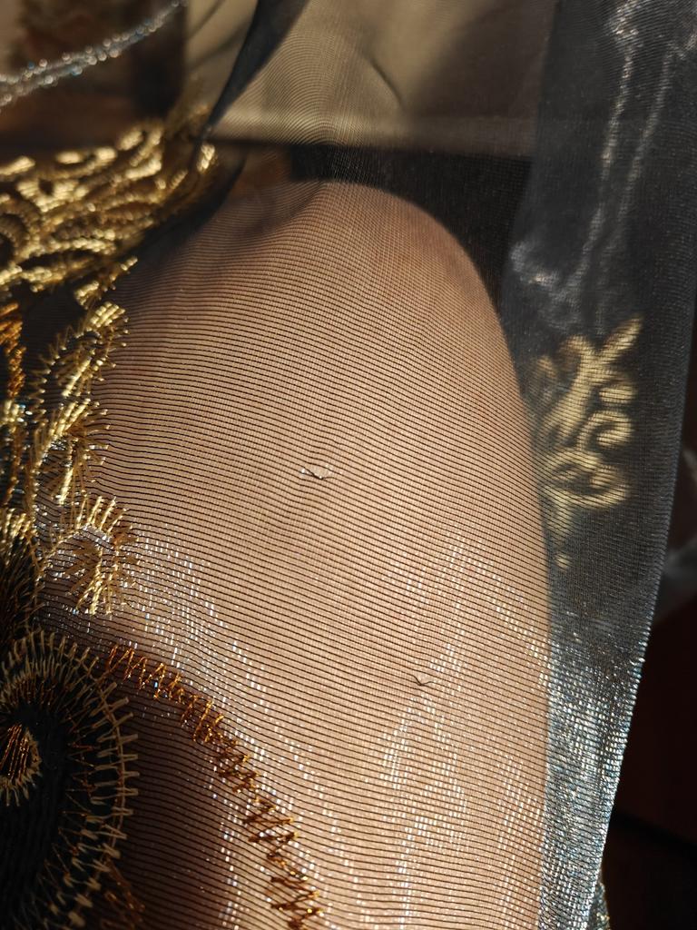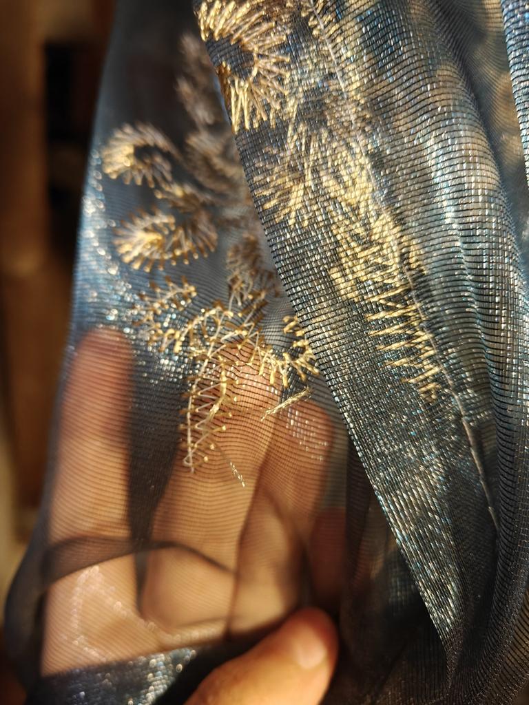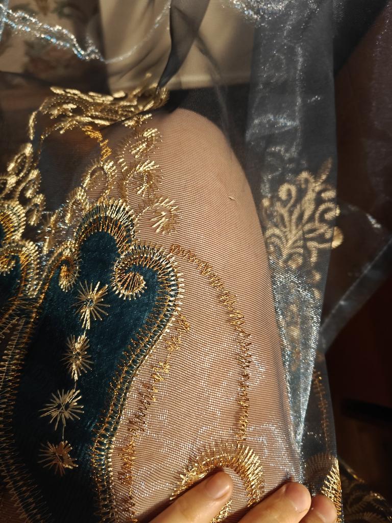 The order arrived very quickly, well packaged. Thank you. The tulle, as I expected, looks luxurious. It is organza with beautiful silk gold embroidery. Gives a slight darkening