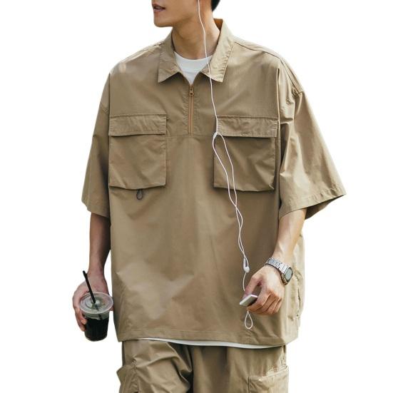 Design: Featuring a classic solid color design, lapels, and half sleeves, this men's top exudes simplicity and elegance. The half-open collar with zipper closure adds a touch of modern flair, while the two large chest pockets provide both functionality and style.