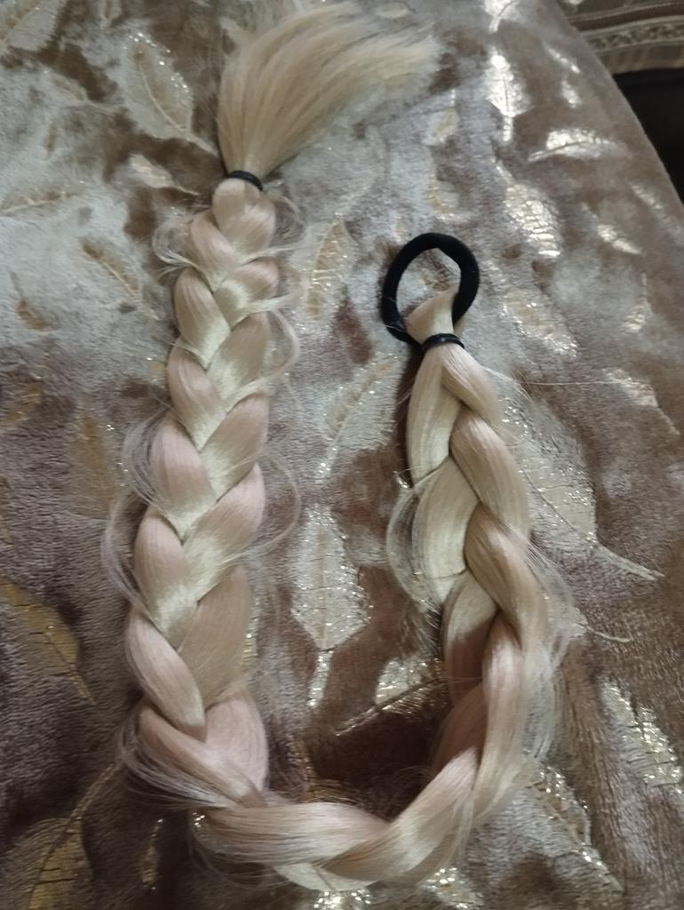 I'm adding to my review of the product: I had to unbraid the braid to weave my own hair, it's not that easy to do it myself, so we got tangled up. I don't understand why they put in black elastic bands for light-colored braids? I'm adding: it's problematic to comb, everything gets caught.