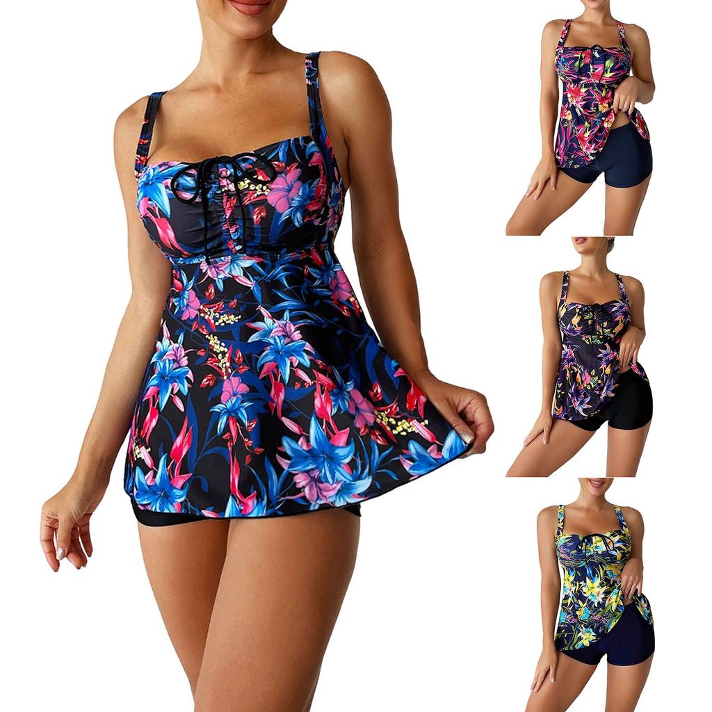 Women's Retro Print Conservative Belly Covering Strap Skirt Boxer Two-Piece Swimsuit