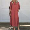 Women's Cotton And Linen Solid Color Casual Round Neck Double Side Pockets 3/4 Sleeve Long Dress