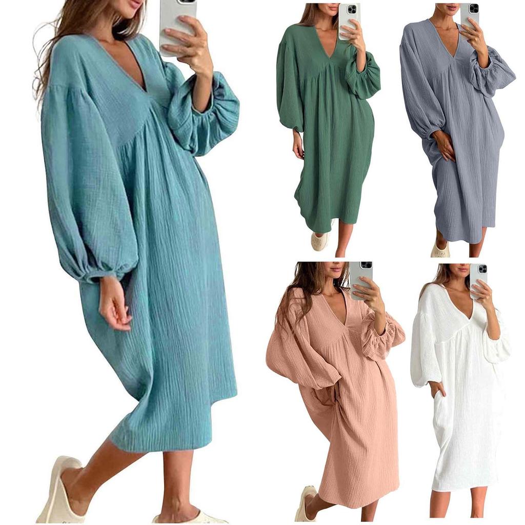 Ladies Casual Living Solid Pocket V Neck Pleated Dress Puff Sleeve Long Sleeve Cotton Dressy Fit Dress