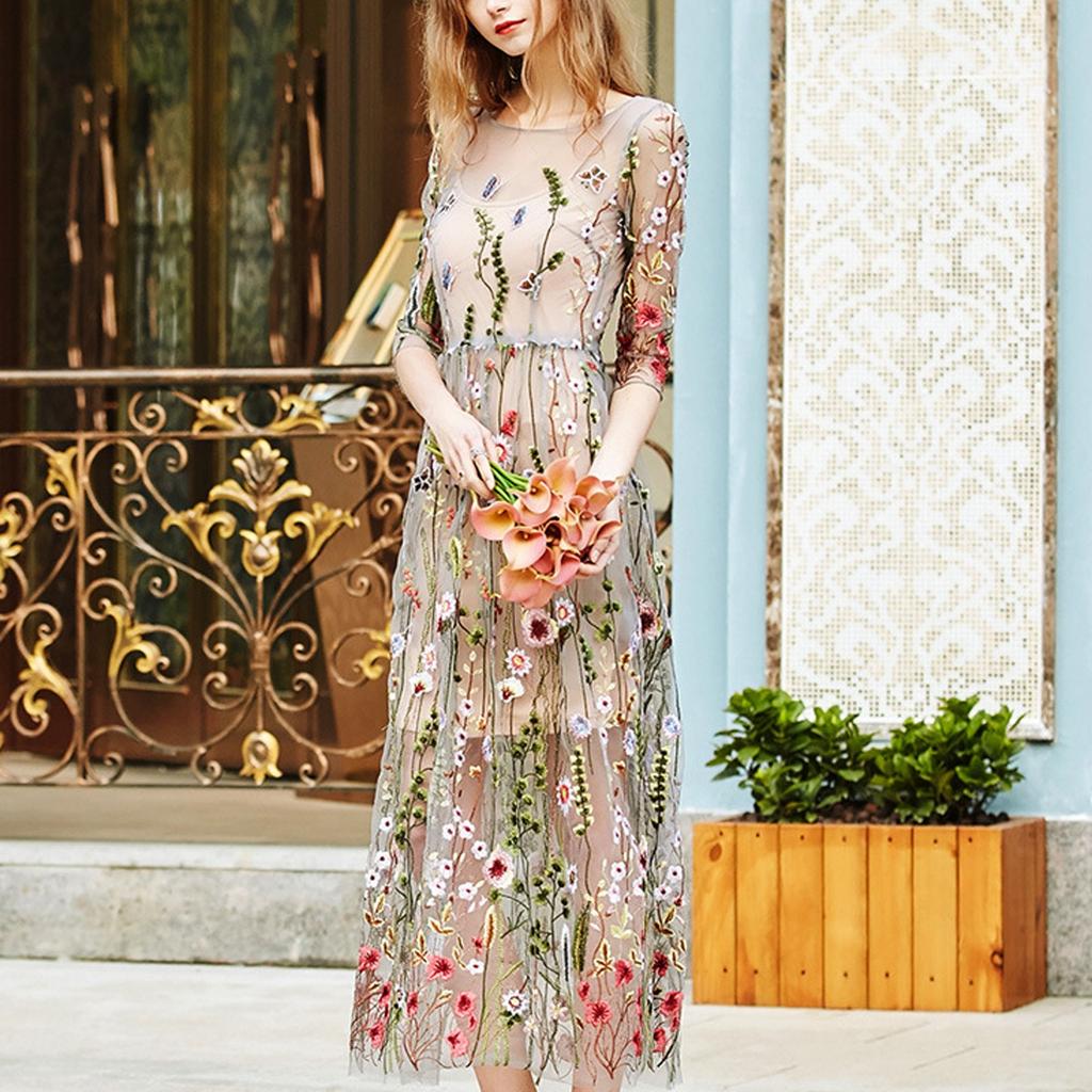 Women's Seaside Holiday Beach Long Dress Mid-length Retro Embroidery Mesh Dress