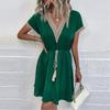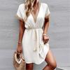 Women's Casual Summer Dresses Trimmed Short Sleeve V-Neck Tie Front Flowy Dress