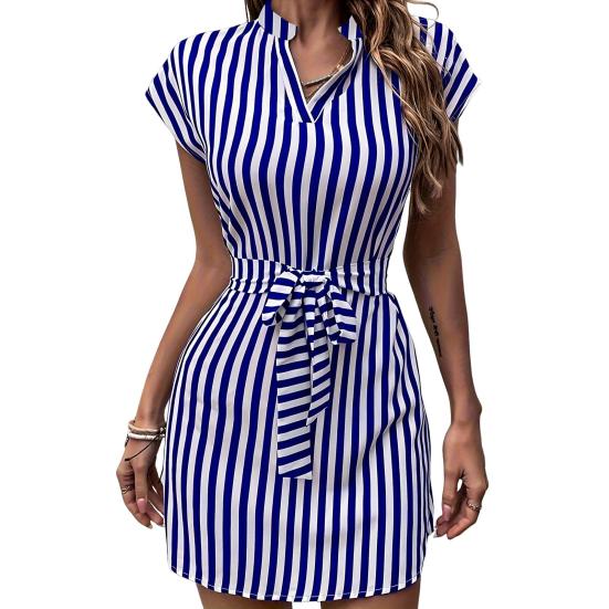 Elevate your style with this chic Women's Dress featuring a flattering V-neck and elegant pleated stitching. The loose cut and waist-cinching ties create a slimming effect, while the striped print adds a touch of sophistication.
