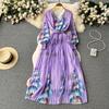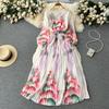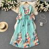 French Chic Dress for Women V-neck Plant Printed Lantern Sleeve Pleated Long Dresses Autumn Dress Female A-line