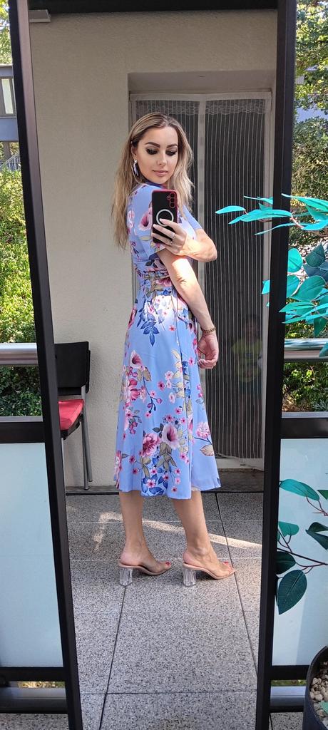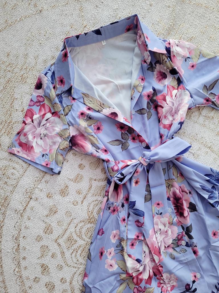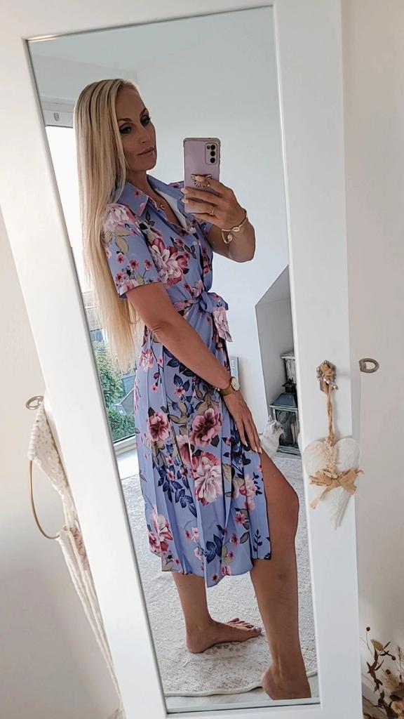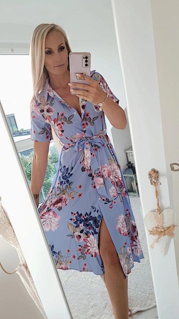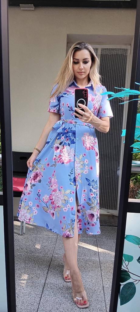* Midi dress with button placket * 💥𝗟𝗶𝗲𝗳𝗲𝗿𝘇𝗲𝗶𝘁 13 Roofs 💥𝗟𝗶𝗲𝗳𝗲𝗿𝘂𝗺𝗳𝗮𝗻𝗴 The delivery includes 1 dress in the corresponding color and size. The dress is available in 3 different colors (apricot, purple and blue) in sizes S to XXL. A matching colour belt is included. I ordered the dress in size S in blue. I wear size 36 to 38. I weigh 62 kg over 172 cm. Cup size 75D. The dress fits me well, although it is not particularly stretchy. 💥𝗤𝘂𝗮𝗹𝗶𝘁ä𝘁 The dress is opaque . The slit goes to the middle of my thigh. The dress has a nice fit and adapts well to the body, thanks to the belt. I particularly like the V-neck and the collar because it shows off the cleavage well. The buttons can be opened completely, so the slit could also be extended 😉👍 I find the belt loops on the sides practical so that the included color-matching belt does not slip 👌 For material composition : 65% POLYESTER 35% COTTON 💥𝗙𝗮𝘇𝗶𝘁 Pretty dress with slit that fits perfectly to the figure. You can order the dress in its original size. It fits true to size. Thanks to Joom and the manufacturer for the great dress 👗