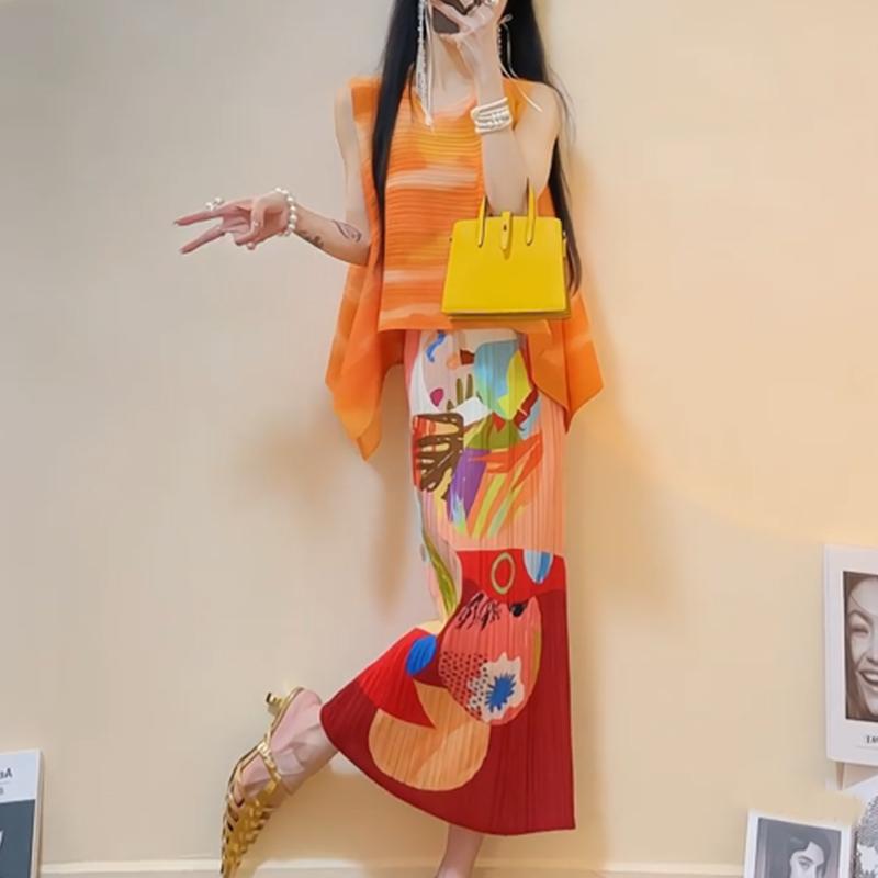 Fashionable printed pleated half skirt, high waisted slim A-line skirt, summer new set for women — buy online with free worldwide shipping!