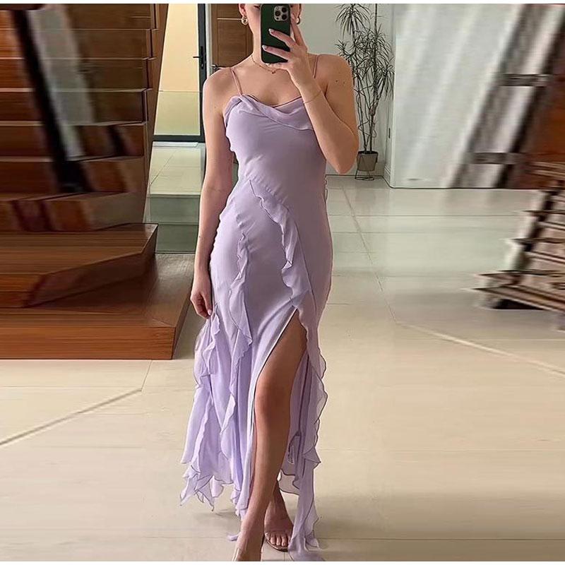 Ruffles Floral Backless V-neck Long Female Camisole Beach Dresses Summer Vacation Side Split Lady Robe — buy online with free worldwide shipping!