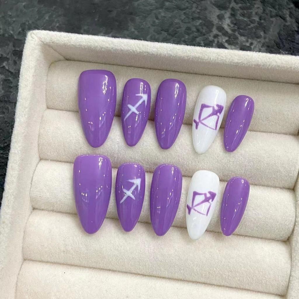HANDMADE Artificial Nail Zodiac Signs - Sagittarius Almond Hand Painted Purple Phototherapy Nails Fake Nails Reusable and Removable Nails