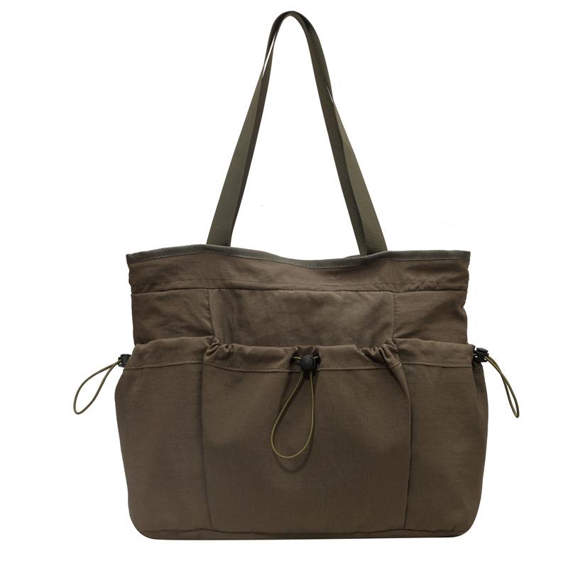 1.Ample Storage: Encompassing a large main compartment and multiple pockets, this fashionable drawstring nylon shoulder bag with its 14.57x11.81x4.72 inch dimensions ensures you have ample space to store your wallet, smartphone, umbrella, water bottle, books, cosmetics, and other daily items, making it perfect for either a shopping spree or a casual outing.