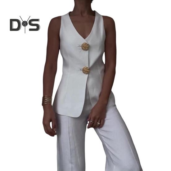 Elevate your style with this chic two-piece suit made of breathable and lightweight polyester fiber. The simple solid color design is versatile for daily wear and complements various body shapes and ages. This summer set includes a sleeveless slim vest and stylish pants, perfect for a sophisticated yet casual look.