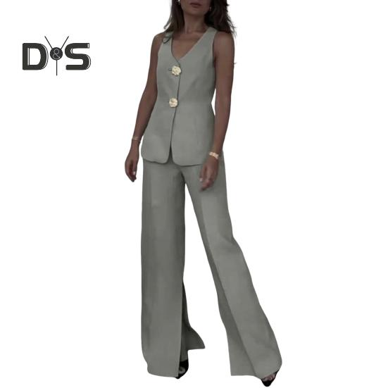 Elevate your style with this chic women's suit crafted from breathable and lightweight polyester fiber. Perfect for spring, summer, and autumn, this suit features a slim fit design that accentuates your figure while ensuring maximum comfort. The straight wide-leg trousers with side slits and uniquely shaped buttons on the top add a touch of sophistication to the overall look. Embrace urban casual vibes with this two-piece set, comprising a commuter sleeveless top and straight trousers that flatter various body shapes.