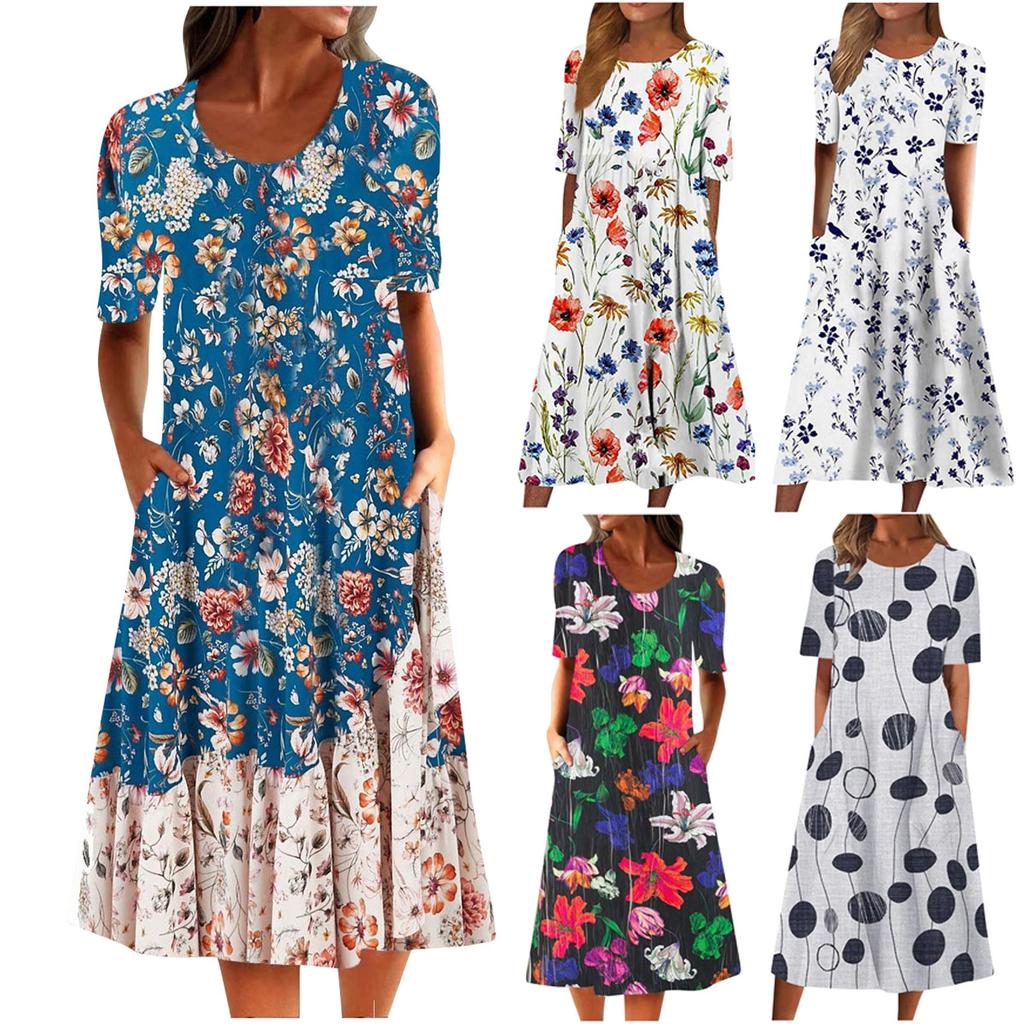Women's Summer Casual Fashion Round Neck Printed Short Sleeve Dress With Pockets