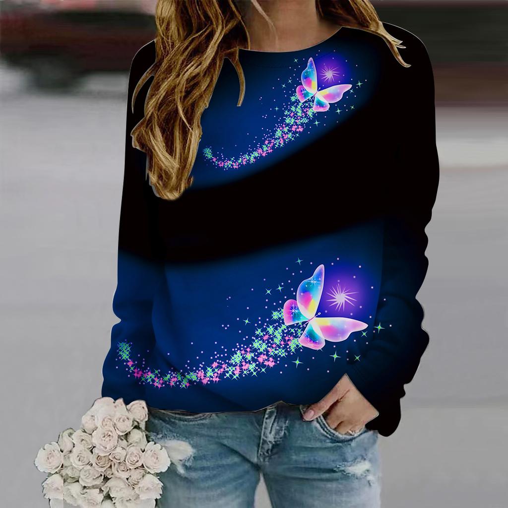 Fall Autumn Women'S Fashion O Neck Long Sleeve T-Shirt Loose Clothes Deep Blue Butterfly Print T Shirt For Girls Street