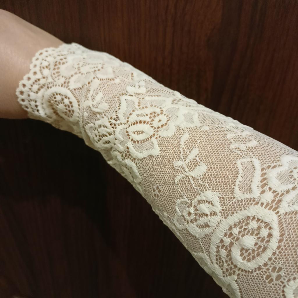 Removable elegant lace sleeves, convenient when it's hot during the day, cool in the evening, put them on and it's already warmer, you can carry them with you. I don't think it will stretch to a full hand, it's just right for me.