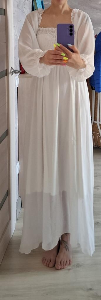 Elegant Maxi Dresses For Women White Off Shoulder Puff Long Sleeve Elastic High Waist Party Gown Ruffle Holiday Dress — buy online with free worldwide shipping!