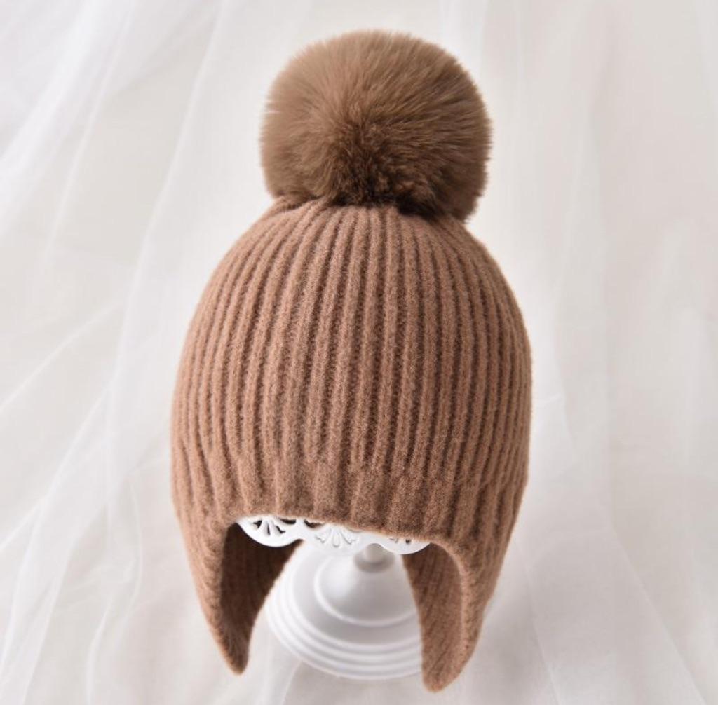 Winter Baby Beanie Hat With Earflap Fur Ball Winter Woolen Knitted Hats For Kids Outdoor Warm Girls Boys Ear Protection Cap