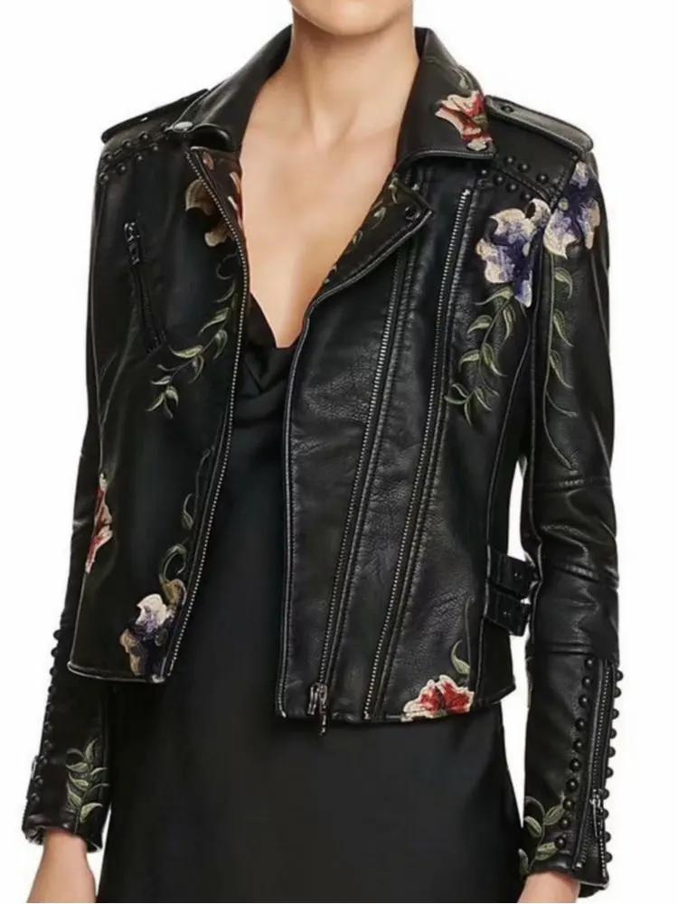 High Street Moto Rivet Black Punk Embroidery Faux Leather Jackets Women Outerwear Biker Spring Autumn Floral Print Coats Plus Size — buy online with free worldwide shipping!