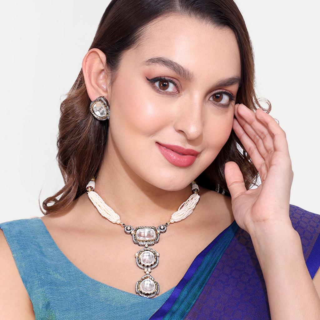 Abdesigns Introducing our elegant Polki Necklace, crafted to perfection to add a touch of sophistication to your traditional look. This beautiful piece of jewellery is designed for women who appreciate the blend of tradition and modernity.
