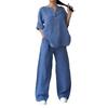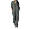Features: The women's casual suit includes a shirt with long sleeves and a single button closure, paired with wide-leg casual pants featuring double side pockets for added convenience. The solid color design exudes simplicity and fashion-forward appeal.