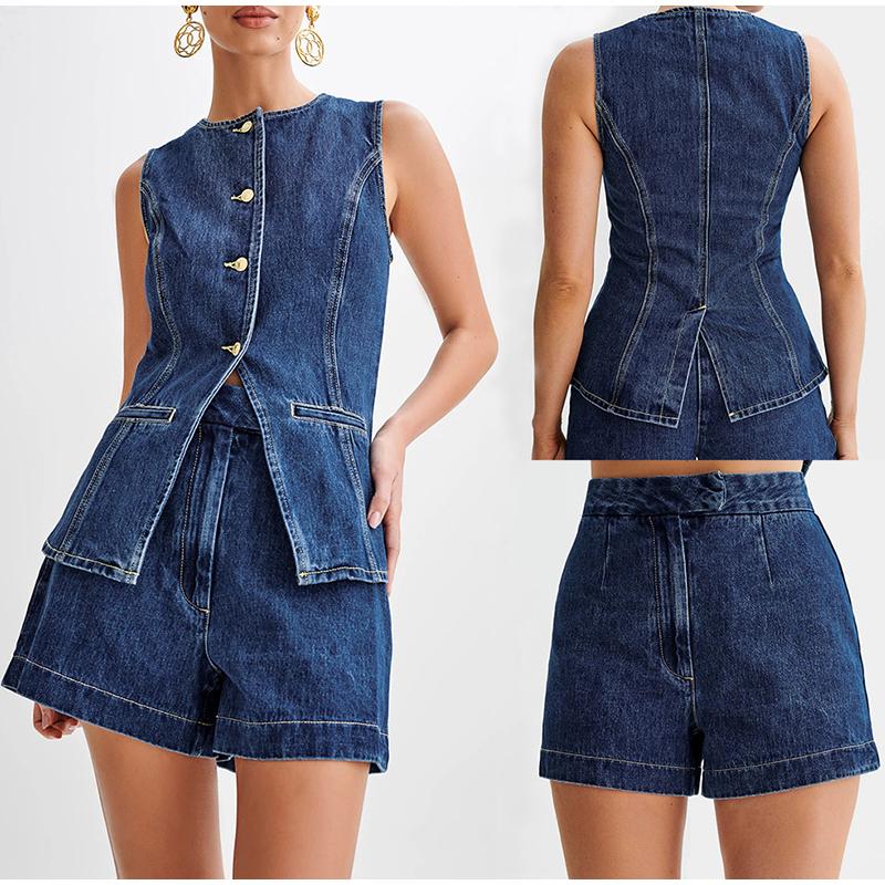 Denim Split Vest Shorts Set Women Single Breasted Sleeveless O-neck Top High Waist Short Pant Summer Lady Suit — buy online with free worldwide shipping!