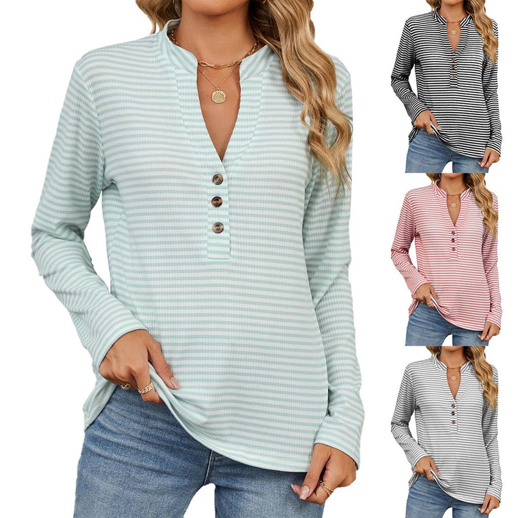 Women's Fashion Striped V Neck SLong Sleeve Button Casual T-shirt Top