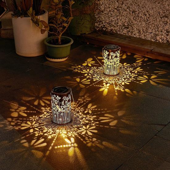 Elevate your outdoor ambiance with these hanging solar lights. Featuring a retro hollow design and warm floral patterns, they cast enchanting shadows on your garden and patio, enhancing their beauty and creating a captivating atmosphere.