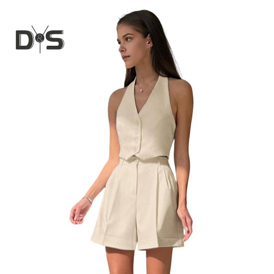 Style: Embrace the chic simplicity of this sleeveless V-neck shorts suit, perfect for the modern woman seeking a versatile and elegant outfit for spring and summer. The understated solid color design exudes effortless sophistication.