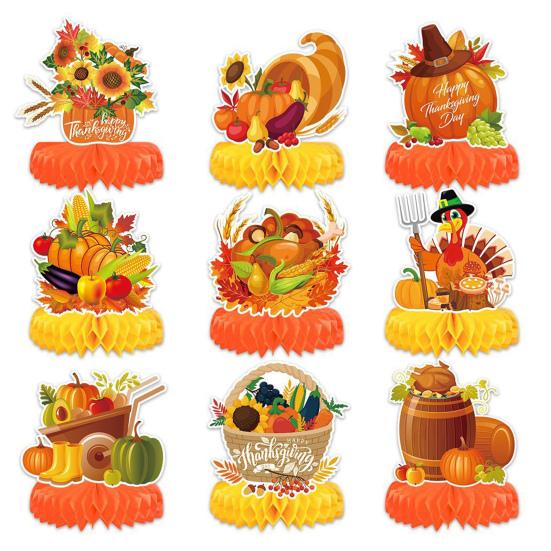 Festive Atmosphere Enhancer: Specially designed for autumn celebrations, these 9 decorative props infuse classic turkey and pumpkin elements with creative honeycomb balls. Effortlessly elevate your dining table or party space with a rich holiday ambiance that radiates warmth and charm.