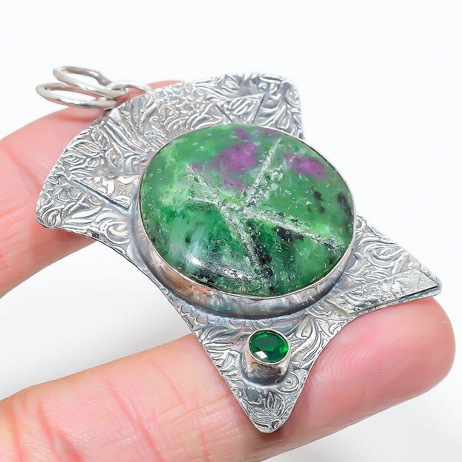 Ruby Zosite, Diopside Lab-Created 925 Sterling Silver Pendant 2.60" q1W47
