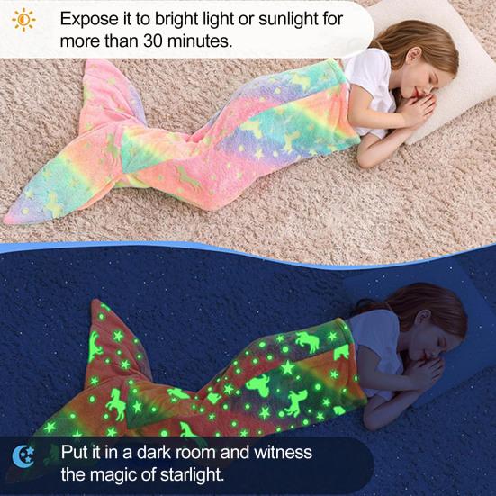 Not only is this mermaid tail blanket warm and lightweight, making it suitable for all seasons, but it also has a magical twist. Expose it to sunlight or use a flashlight to charge it up, and watch as it glows in the dark, creating a fun and enchanting experience for your child.